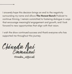 Nigerian media personality Chinedu Ani Emmanuel, popularly known as Nedu Wazobia, has announced his departure from The Honest Bunch podcast.